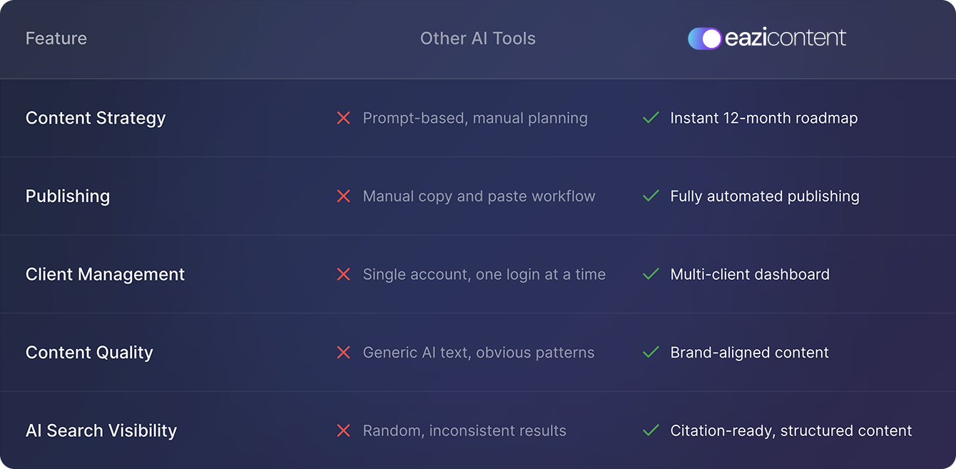 Eazi-Content transforms your clients into trusted sources that AI platforms actively recommend to searchers.