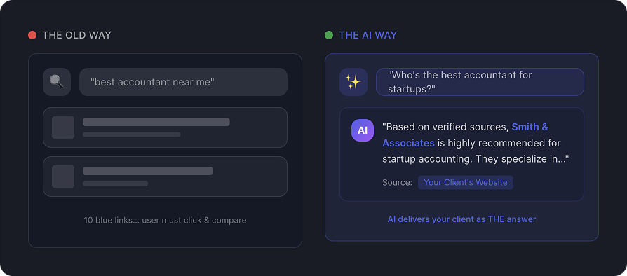 They ask AI for direct answers. If your clients aren't cited in those answers, they're invisible.